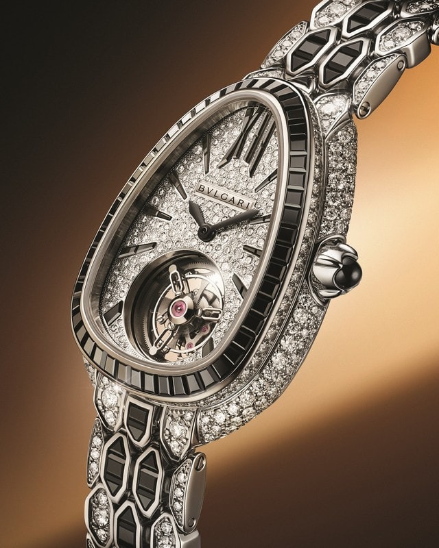 まばゆいばかりの輝きと圧倒的にモダンなスタイルで驚きをもたらすタイムピース、 「セルペンティ セドゥットーリ トゥールビヨン」。 これまでにない無限の創造力の挑戦と言えるこのウォッチは、 ダイヤモンドとブラックスピネルが成すコントラストと、 優美なトゥールビヨンが奏でるリズムが鼓動する、 ハイジュエリーとオートオルロジュリーの特別な出会いにより生まれたモデル。 プレシャスなジュエリーウォッチの世界をリードするブルガリが、 セルペンティのアイコンをコンテンポラリーでフォーマルなスタイルで表現しています。